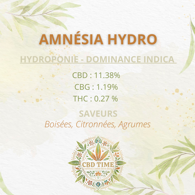 Les fleurs d’Amnésia HYDRO, avec leurs teintes vertes vibrantes et arômes complexes d’agrumes, de pin et d’épices, offrent une expérience sensorielle unique et apaisante, idéale pour une relaxation profonde grâce à leur culture en hydroponie, tout en respectant les normes légales avec un taux de CBD de 11.38% et un THC inférieur à 0,3%.